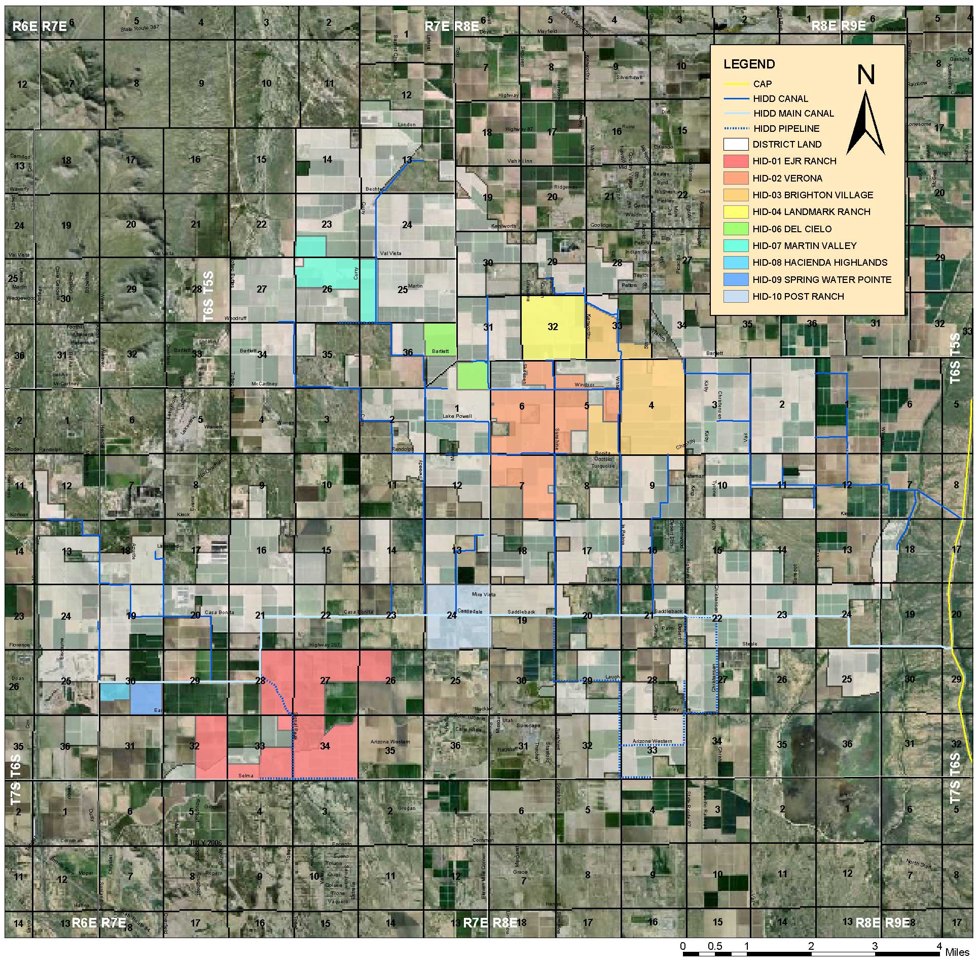 Hohokam Irrigation & Drainage District (HIDD) is located Northeast of Casa Grande, southwest of Coolidge in Pinal County, Arizona. It is composed of 29,600 acres, of which 28,200 are irrigable acres. However, some of the 28,200 irrigable acres have been reduced due to urban development. HIDD was formed in 1972 under Title 48 of the Revised Arizona State Statutes. The land within HIDD is currently irrigated with Central Arizona Water Conservation District (CAP) water and supplemented with private groundwater wells. The District's main canal is approximately 15 miles in length and the system has approximately 60 miles of open, concrete lined laterals and pressure pipelines.